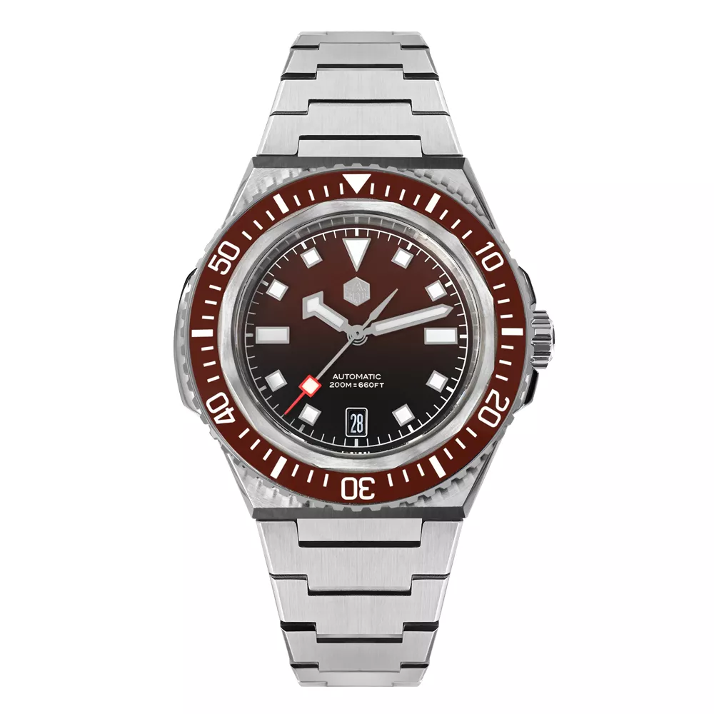 This diver’s watch features a robust 316L stainless steel case with a unique integrated shape that offers both visual balance and superior strength. The 12-sided design around the sapphire crystal represents the 12-hour scale, adding a subtle touch of geometric harmony. Paired with a ceramic bezel insert and unidirectional 120-click rotation, this bezel offers tactile precision and visual impact. Available in rich gradient blue, green, or brown dials, the colors shimmer with depth, adding a bold twist to your daily style.