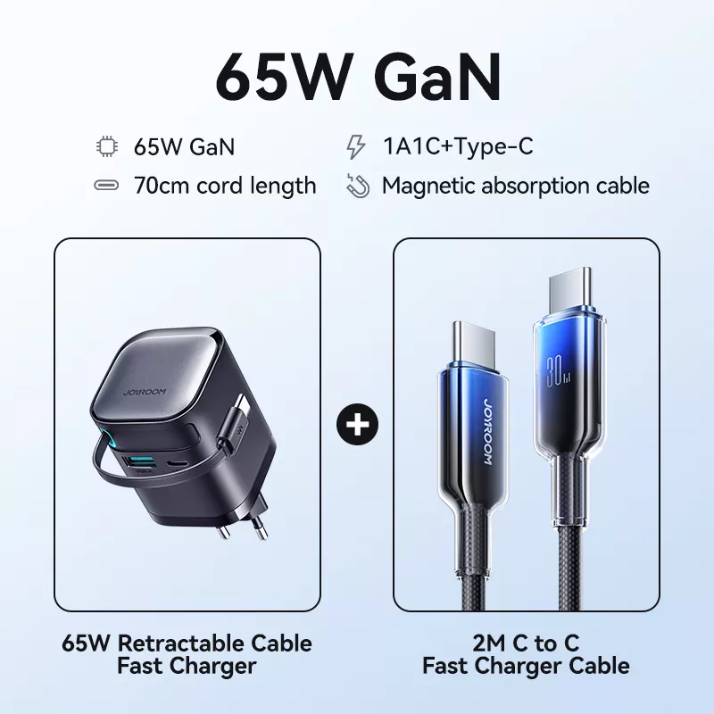 Engineered with advanced Gallium Nitride (GaN) technology, this charger delivers high-efficiency power with less heat and energy waste. Its 65W maximum output supports fast charging for multiple devices simultaneously, while the retractable USB-C cable stretches up to 27.5 inches for added flexibility and convenience. The charger’s compact size, foldable plug, and universal voltage compatibility make it the perfect travel companion, offering seamless charging wherever you are.