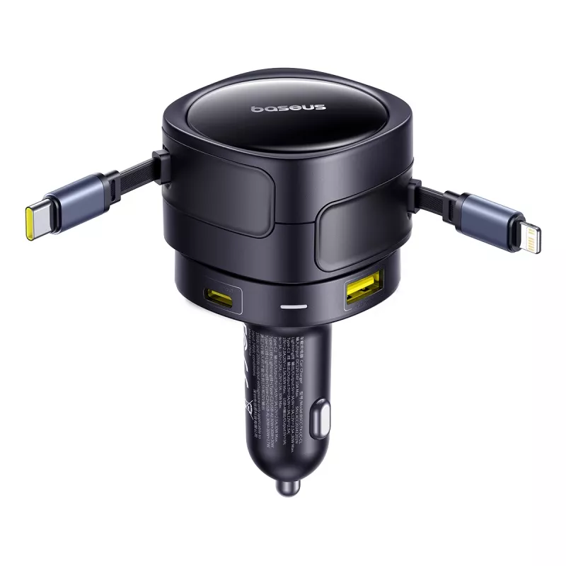This compact charger plugs effortlessly into your car’s lighter slot, giving you two powerful USB outputs to charge multiple devices at once. Its retractable cable system allows you to keep your car organized while ensuring that the cables never get tangled. Whether you’re charging your iPhone, tablet, or other USB-powered devices, this charger has you covered with up to 90W of output power, delivering a fast and reliable charge every time.