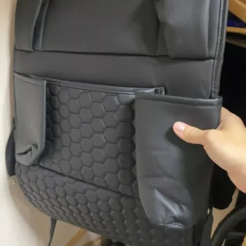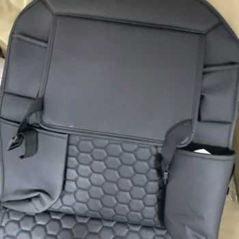 Crafted from eco-leather, this seat back organizer is waterproof and easy to clean with a damp cloth. The clear TPU pocket is also waterproof and safe for babies. All materials used are vegan and non-toxic.