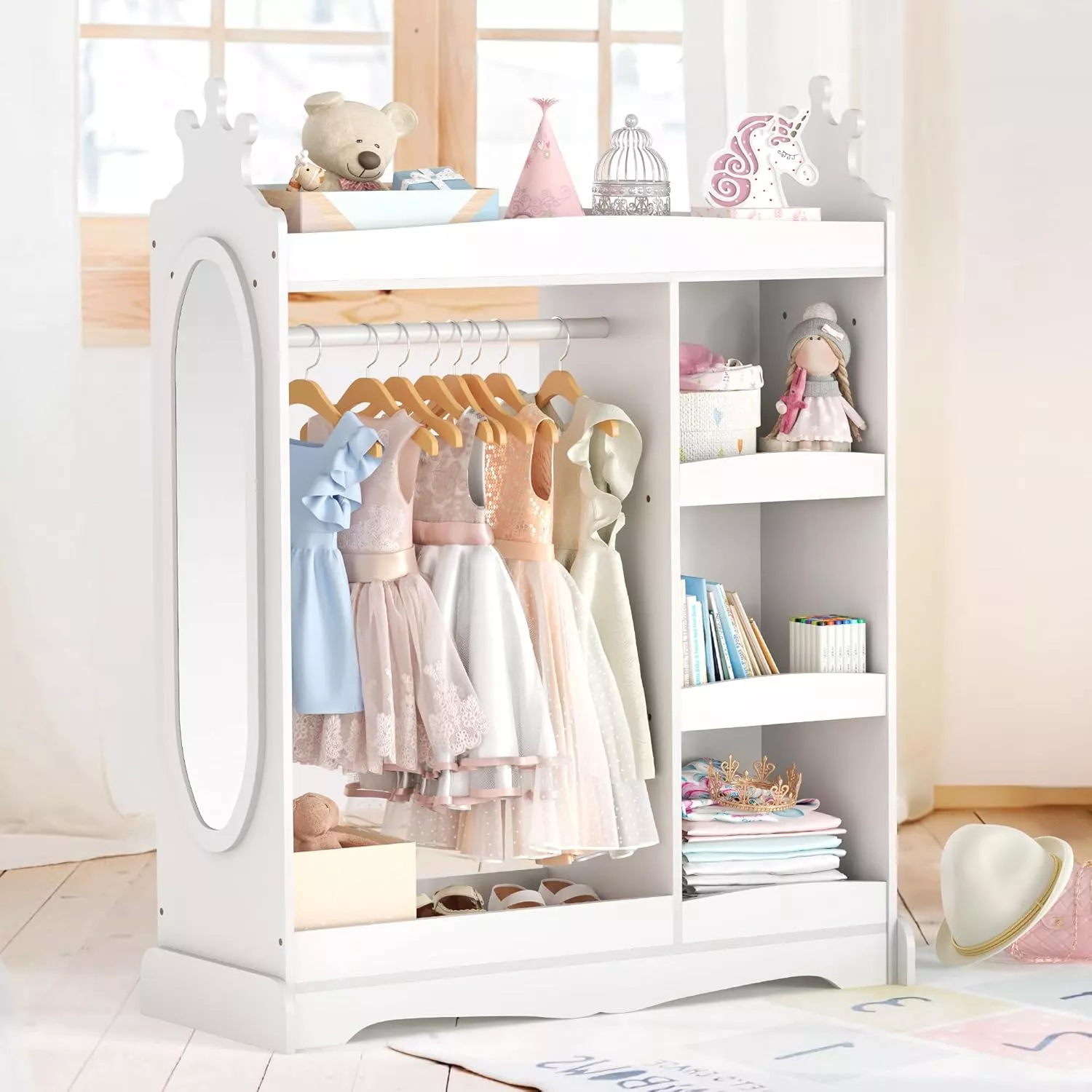 • Ample Storage Space: The wardrobe measures 44.1 x 33.5 x 13.4 inches and includes multiple compartments for clothes, shoes, hats, and toys. The design features a hanging rack for dresses, a top shelf for toy storage, cubbies for decoration, and hooks for jewelry and bags.