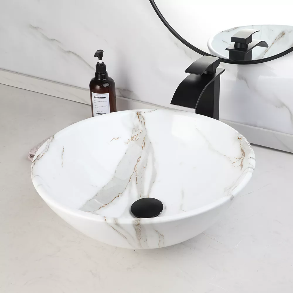 Transform your bathroom into a spa-like sanctuary with this sleek and contemporary ceramic bathroom vessel basin. Designed to impress, this round vanity sink features an elegant marble design that combines both sophistication and functionality. Perfect for modern homes, this above-counter sink is a beautiful addition to any bathroom, offering a seamless balance of style and utility.