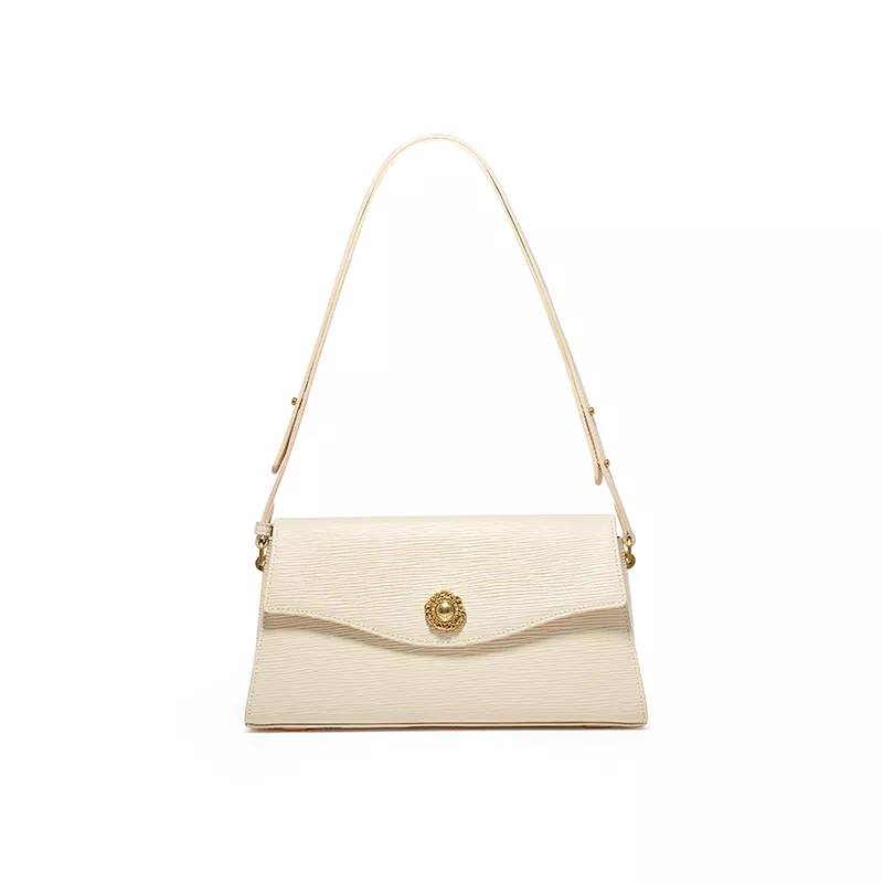 Crafted from high-grade split cowhide leather, the bag boasts a structured, refined shape that holds its form and adds architectural interest to your look. The baguette silhouette tucks neatly under the arm or can be worn as a crossbody thanks to its versatile single strap. With its solid color, sleek cover closure, and minimalistic exterior, this piece is a canvas of elegance, ready to elevate your wardrobe.