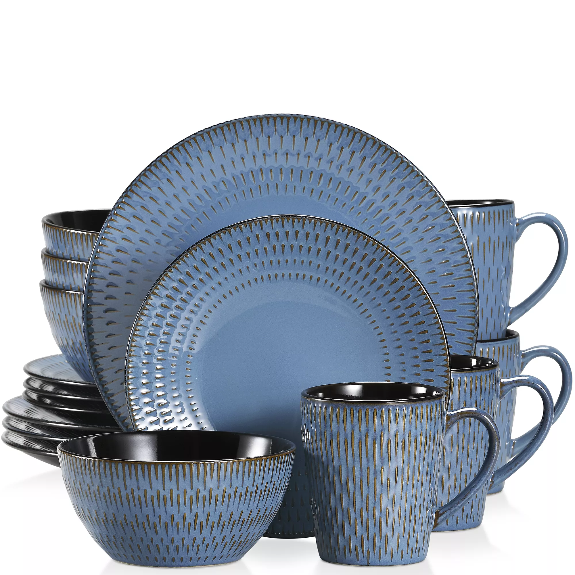 This stoneware dinnerware set stands out with its vibrant, glossy blue finish and unique embossed rain-stripe design. The single-layer kiln changing glaze process creates a captivating color blend that makes each piece look like a work of art. Not only do these pieces bring a sophisticated style to your table, but they are also practical. Designed to withstand the wear and tear of daily use, they are microwave, oven, and dishwasher safe, making cleanup and reheating a breeze. Plus, the stoneware construction offers superior durability, so you can enjoy them for years to come without worrying about cracks or chips.