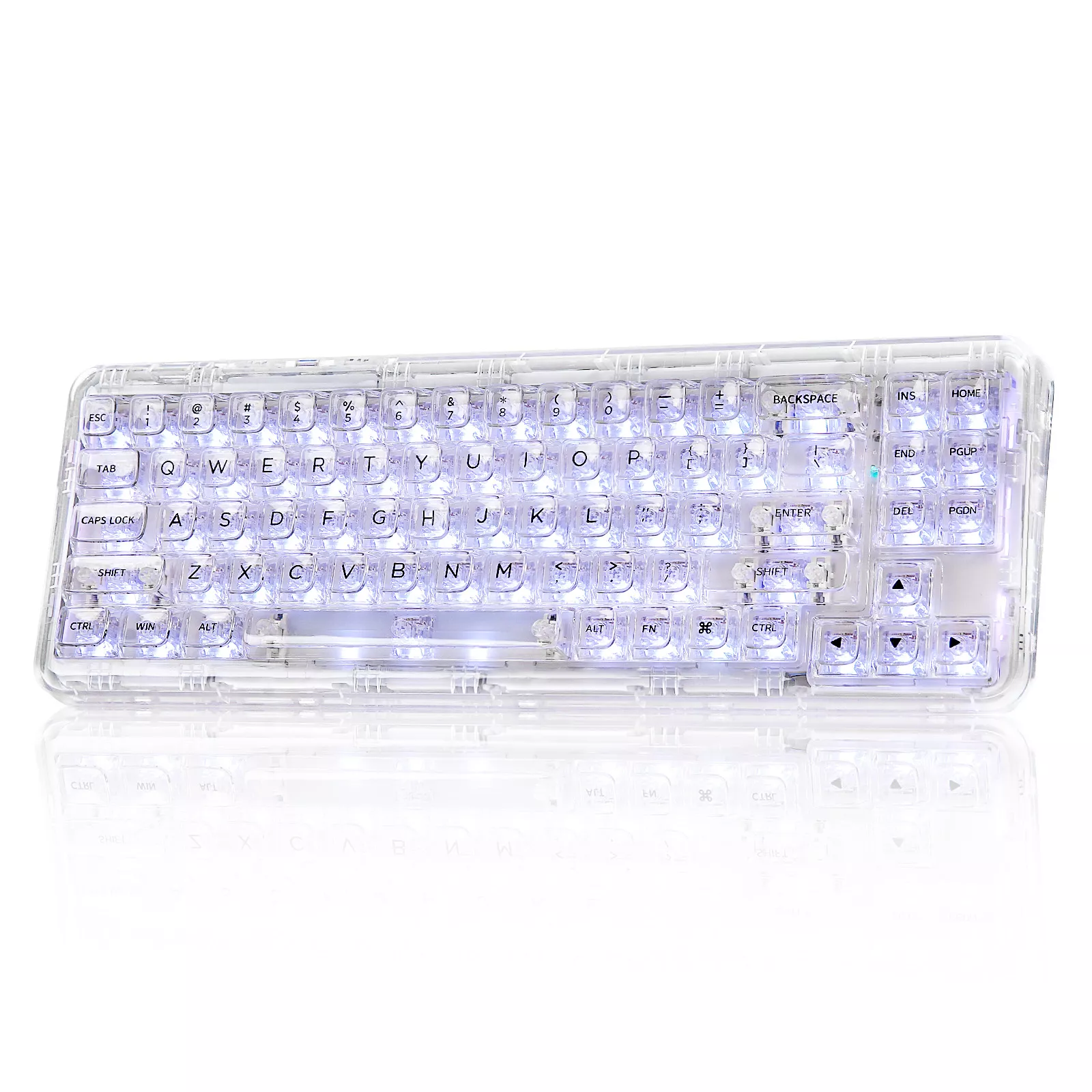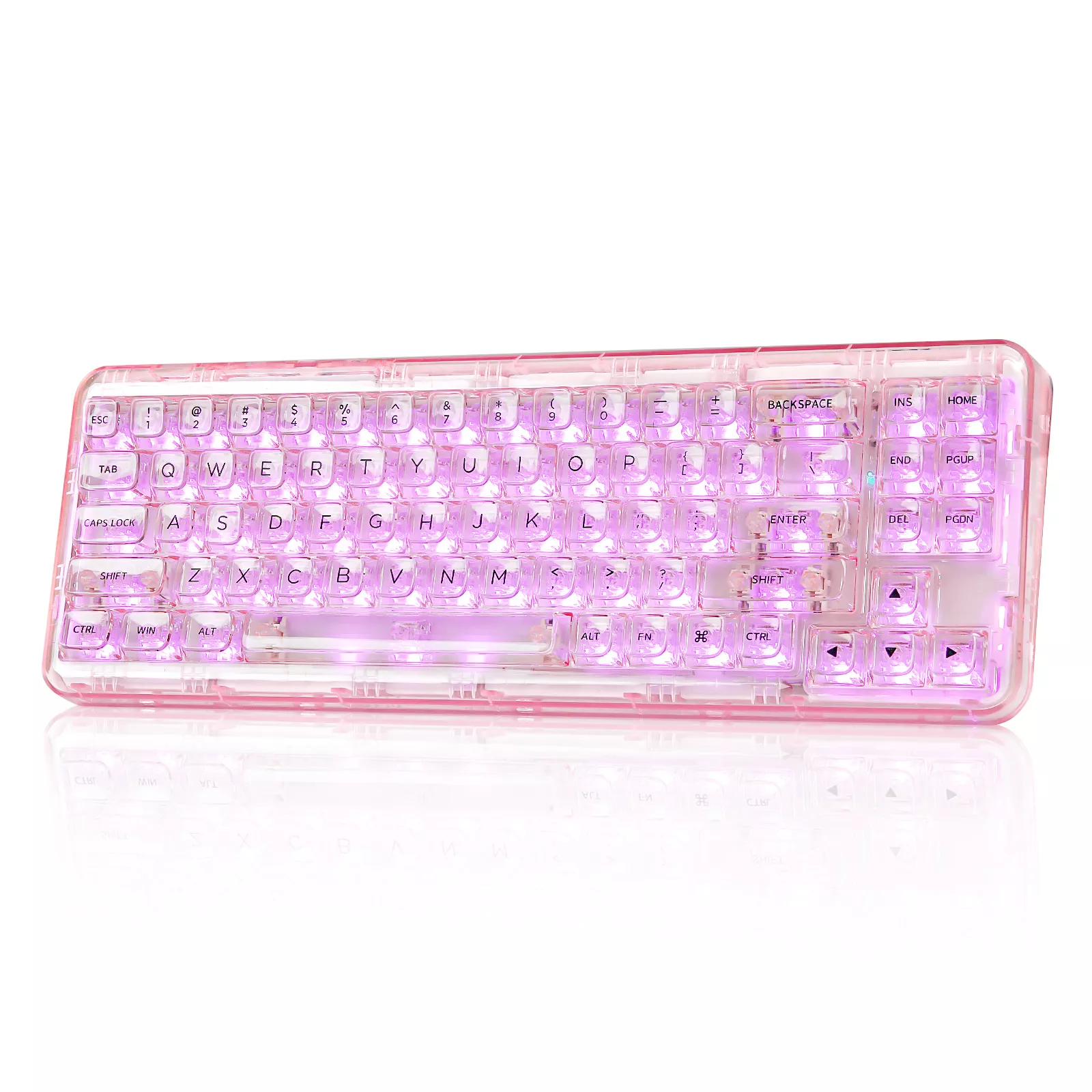 Elevate your desk with a mechanical keyboard that’s built to impress—visually and functionally. This wireless RGB keyboard blends a compact design with powerful features to deliver an unbeatable typing and gaming experience. The clear PC casing and high-transparency shine-through keycaps not only look incredible, but also allow the vibrant south-facing RGB lighting to glow through with stunning clarity. Whether you’re gaming late into the night or powering through a work session, this keyboard stands out as a centerpiece of your setup.