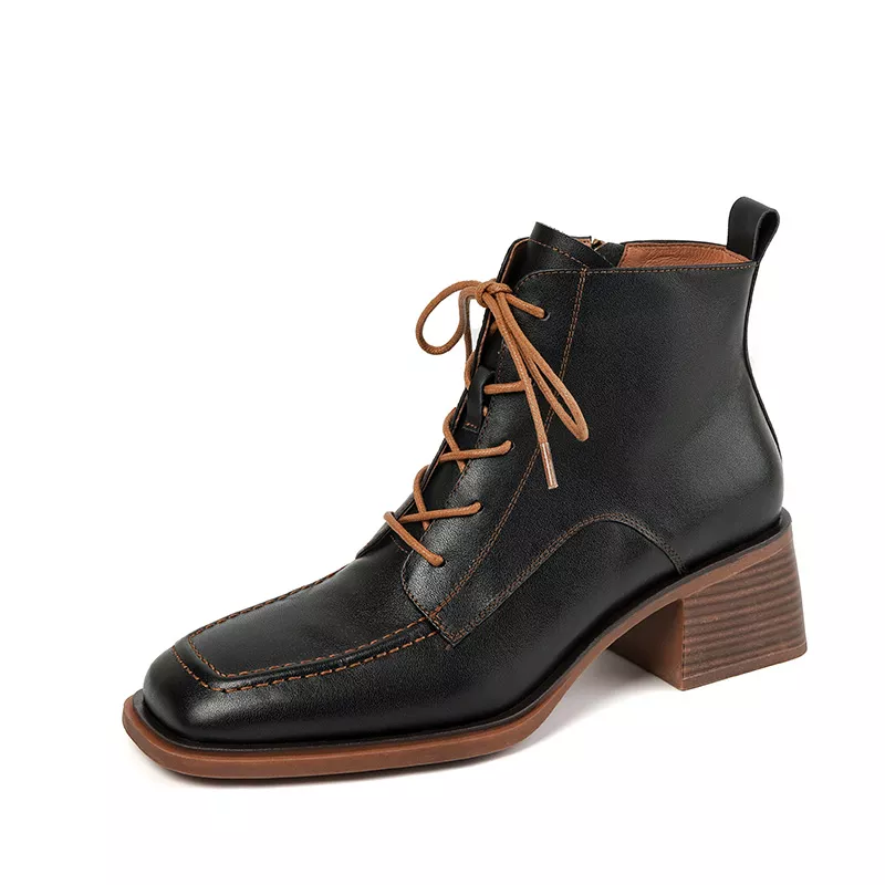 Step into timeless sophistication with these handmade genuine leather ankle boots, crafted for women who appreciate both style and substance. Designed with a luxurious cowhide upper and a chic square toe, these boots effortlessly blend modern elegance with retro charm. The cross-tied lace-up front adds a touch of classic character while offering a snug, adjustable fit.